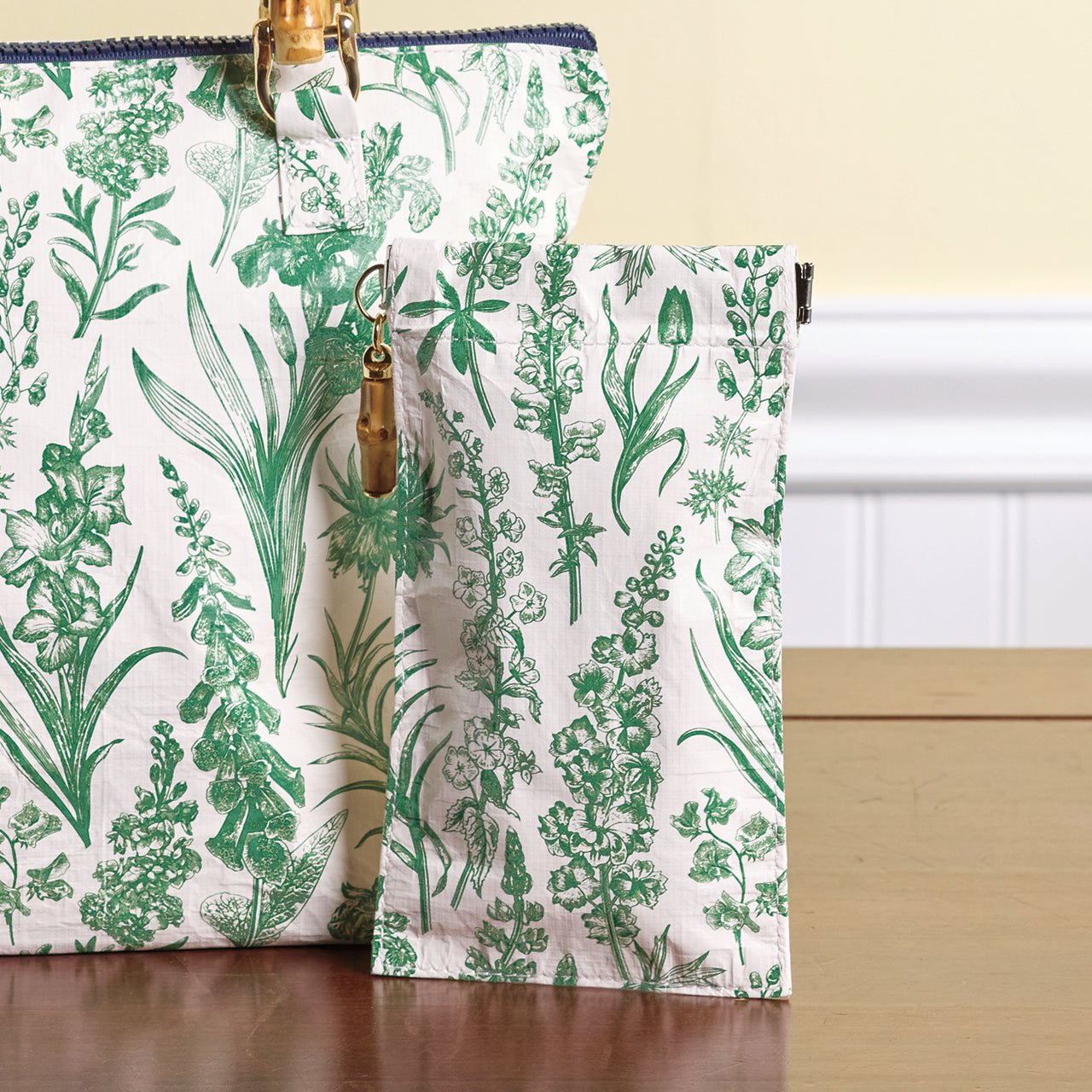This perfectly packable, stylish eyeglass case features a floral print with tulips, foxglove, irises and more, on water-resistant material. Finished with a bamboo pull. Blue and white bamboo print interior. 7 1/4" h x 4"w.