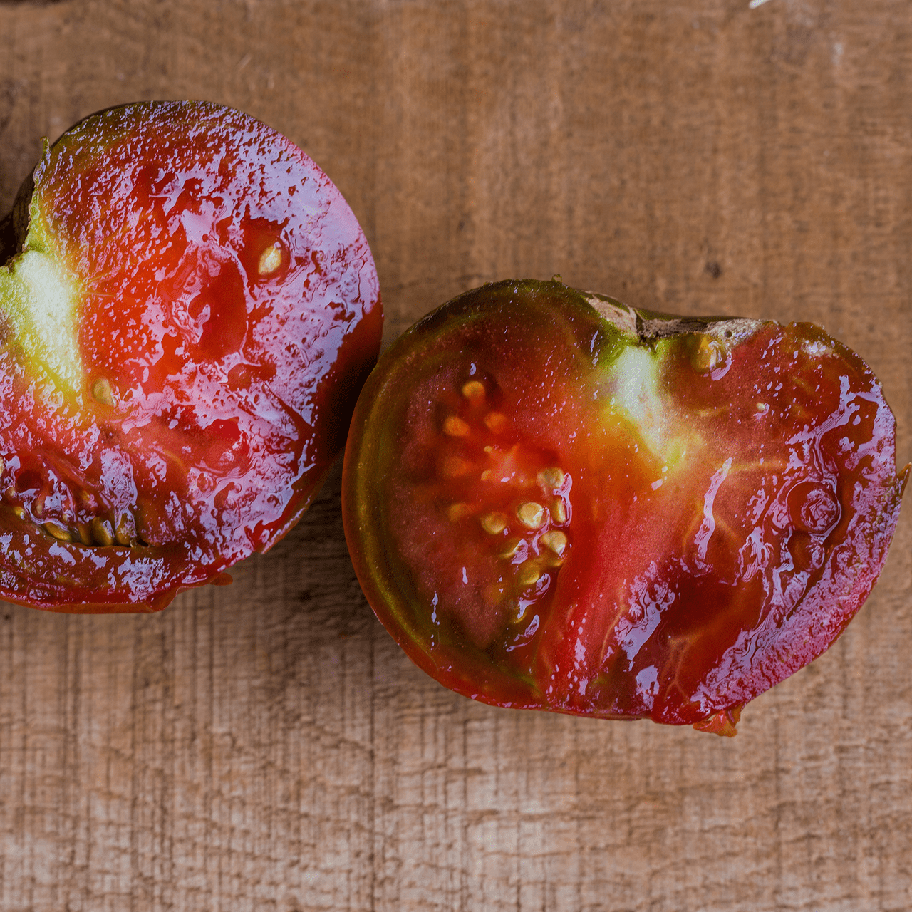 This Tennessee heirloom, sometimes called a black tomato, reputably originated from the Native Cherokee Indians before 1890. The unique color of the dark, dusky purple fruits carries through the flesh to the stem end. The large, highly flavorful fruits of the Cherokee Purple Tomato are smooth with slightly ridged shoulders. This is a disease-resistant, indeterminate variety.