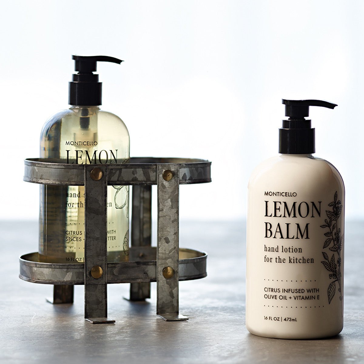 Inspired by Jefferson the gardener, our private label hand soap and hand lotion have refreshing, invigorating aromas, like many of the herbs and fruit trees he planted. The soap is infused with Lemon balm, spices and shea butter, while the lotion is lemon infused with olive oil and vitamin E. 16 oz. each. Galvanized metal bottle holder.