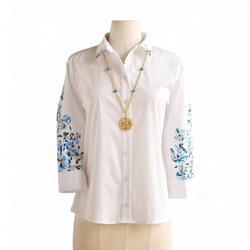 Delicate blue flowers adorn the ¾ length sleeves and collar of this classic white blouse. The floral accents add a refreshing pop of color, making the blouse versatile for various occasions. Sizes: S, M, L, XL.