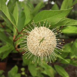 Description: Deciduous, summer flowering North American shrub bears ball-like heads of small, very fragrant, white or cream-colored flowers; glossy, medium-green leaves with red veins and midribs, arranged in whorls of 3