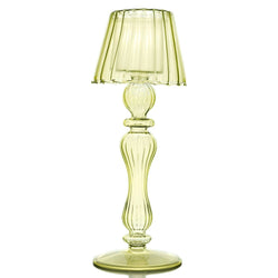 Delicate details add to the uniqueness of this exquisite green glass candle lamp, crafted from mouth-blown glass. Holds a votive or tealight candle. 8 3/4"h x 3 ¼" dia.