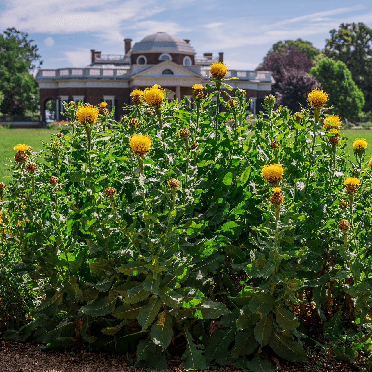Globe Centaurea, also called Great Golden Knapweed, is a robust perennial from the Caucasus, introduced to Britain by 1805. Philadelphia nurseryman Bernard McMahon sent seeds to Thomas Jefferson in 1812. The plant forms clumps 3-4' high with large, thistle-like flowers in early summer. Its chestnut-brown buds open to expose a crown of rich yellow florets. Jefferson-documented: This plant was documented by Thomas Jefferson in his Garden Book, Notes on the State of Virginia, or other writings.