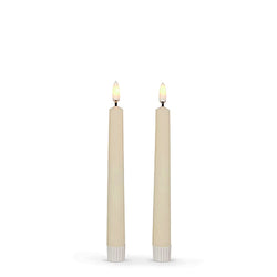 Sold as a set of two, these wax flameless taper candles are battery operated with a realistic flame. Each candle requires one AAA battery. 6-hour timer repeats every 18 hours. 7"h.